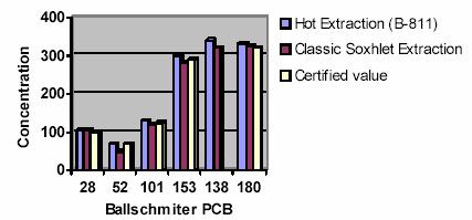 我們比較了采用 Buchi B-811 萃取儀(熱萃取模式)和采用索氏標(biāo)準(zhǔn)法進(jìn)行淤泥中的PCB 和PCDD/F 測(cè)定。在測(cè)定PCB 時(shí)我們采用標(biāo)準(zhǔn)淤泥(0.1-0.4mg/kg),并采用環(huán)形測(cè)試材料(0.07-1.2mg/kg)。淤泥中的毒素含量約為46ng TEQ/kg。我們比較了采用兩種不同的方法,索氏標(biāo)準(zhǔn)法和熱萃取法進(jìn)行對(duì)比。采用Buchi公司的B-811萃取儀中的熱萃取模式可以大大縮短萃取時(shí)間,減少所需要的溶劑量,并且溶劑可以重復(fù)使用至少3-4次,大大提高了效率,節(jié)約了成本。